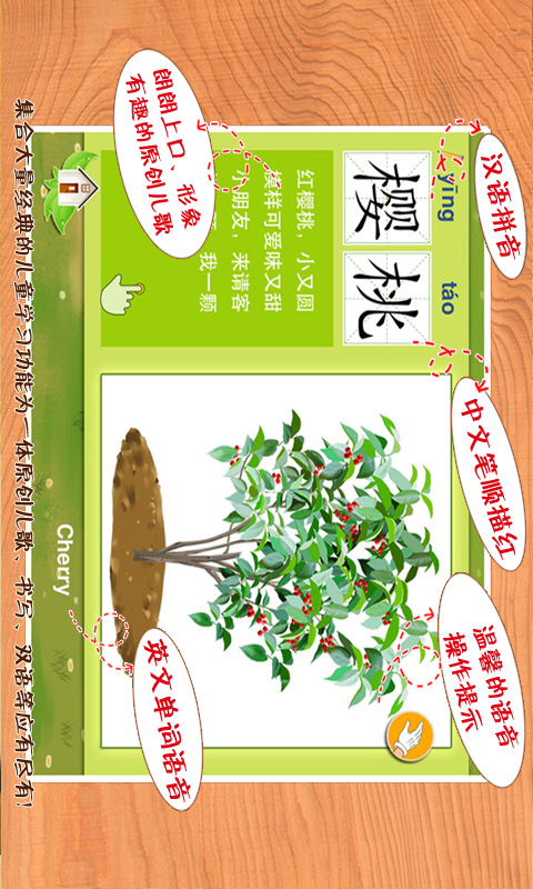 宝宝种水果集合大量经典的儿童学习功能为一体,原创儿歌朗诵,笔顺练习,英文发音等应有尽有!
