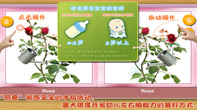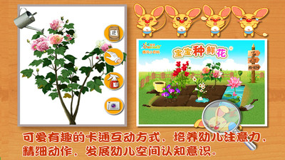 0-2岁宝宝:通过点击浇水或施肥等操作按钮来完成种植,并享受鲜花拍照留念的操作过程。
