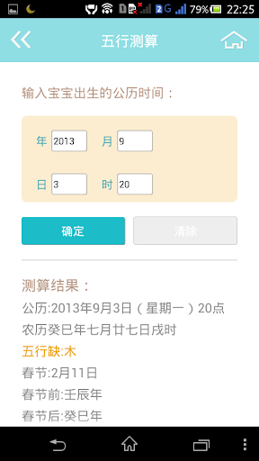 - 五行查询:输入出生日期时间,即可查询五行缺旺。