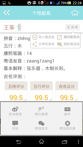 - 我的备选名: 帮你轻松记录中意的备选名,分享给微信/微博亲友,让大家一起帮你的宝宝选个好名字!