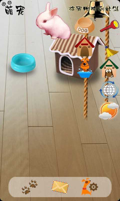 小白兔白又白,两只耳朵竖起来,蹦蹦跳跳真可爱!还记得这童谣吗?赶快来领养一只手机桌面宠物小白兔吧!非常可爱的真实小白兔哦,使用很简单,首次打开进入后,会发现一个美女旁边有很多箱子,小白兔就藏在箱子里哦,随即点击箱子小白兔就有可能出来与你见面哦!之后你就是它的主人了,点击宠物移动到手机最上方会弹出功能框,吃饭啊,刷牙啊,打扫啊等等,算是个桌面小游戏吧,它还会时不时给你各地新闻哦,还会说笑话呢,挺有意思的,萌萌的宠物小白兔在学习工作之余给你带来乐趣!