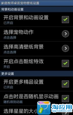 家庭教师桌面宠物动态壁纸: 1.桌面宠物,在此款动态壁纸里加入了超萌桌面宠物,提供多种有趣的动作供您互动。 2.DIY,动态壁纸太单调吗?点击【设置壁纸特效】按钮,就可任意DIY您想要的效果搭配。 3.下雨、雪,想看看宠物在下雨、雪天气有什幺反应吗?不妨试试这个效果。