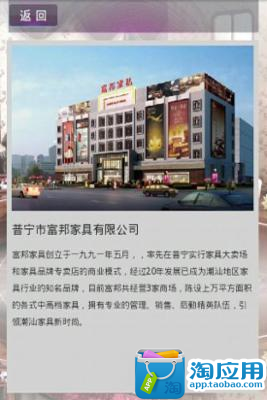 富邦家具创立于一九九一年五月,,率先在普宁实行家具大卖场和家具品牌专卖店的商业模式,经过20年发展已成为潮汕地区家具行业的知名品牌,目前富邦共经营3家商场,陈设上万平方面积的各式中高档家具,拥有专业的管理、销售、后勤精英队伍,引领潮汕家具新时尚。
