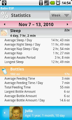 - 詳細統計資料,顯示寶寶所有活動的平均值和總值