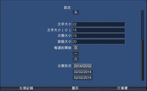 您可以自由設定文字的大小、畫面的方向、行事曆裡頭要以月或週為單位來顯示。