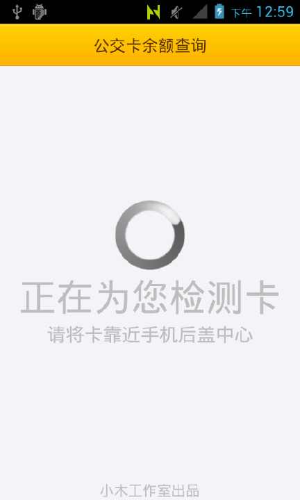 2. 打开'小木公交'软件,提示'正在为您检测卡',这时候将深圳通卡放到手机后盖的NFC天线位置。保持一秒钟左右,余额就能读出来了。
