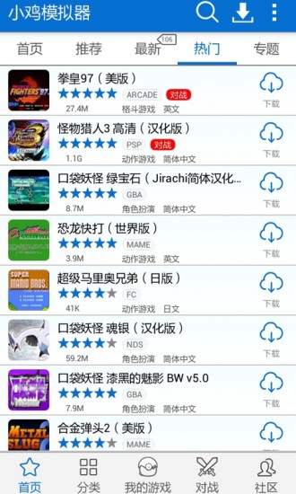 小鸡模拟器:街机掌机最全、经典游戏最多的游戏模拟器!【最全】街机、掌机PSP/NDS/GBA、家用机FC/SFC等十几款经典游戏机!【最多】上万款经典游戏、数千款汉化精品,全部验证可玩!【最简单】下载安装一键完成,游戏/机种分类一目了然!【最快速】免费高速下载,支持多线程同时下载!【最懂你】支持联网/WIFI/蓝牙对战,支持存档,支持本地游戏拷贝!玩家QQ群:90285760、309158485、301110619小鸡官网:http://www.xiaoji001.com