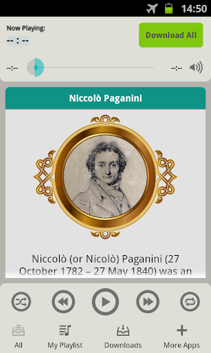在這種android 免費應用程式,您可以選擇了解更多關於在尼可羅•帕格尼尼傳記作曲家,或聽一些作曲家的最流行的古典音樂。