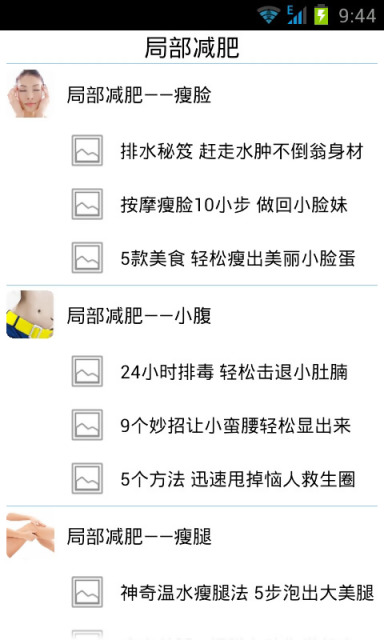 局部减肥是指对身体特定部位进行锻炼,从而达到减去此部位的脂肪的目的。本应用给大家介绍了脸部,小臂,大腿,小腹等各个部位的减肥瘦身方案,如果你全身减肥做不到,那么把容易暴露的部位减掉吧,大家看到的依然是一个苗条漂亮的你。