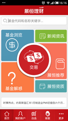 信息齐全。功能包括基金交易、基金浏览、展恒推荐、新闻资讯和 基金解惑等几大模块,功能完整且有展恒精心推荐的产