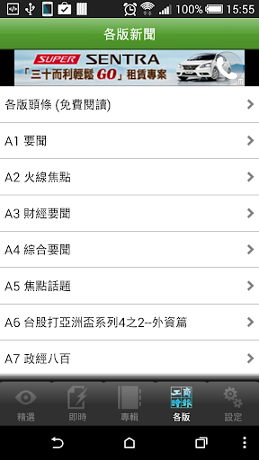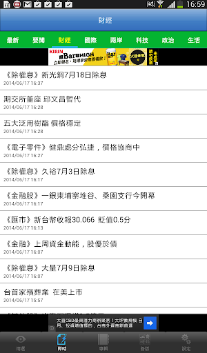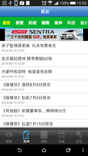 「即時」:每日全天候的最新資訊,包含:要聞、政治、生活、財經、國際、兩岸、科技類新聞。