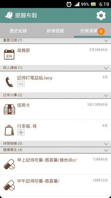 内建8种常用设定:打电话、传讯息、前往某地、带东西、缴费、重要日期、看电视、吃药。只给你需要的相关栏位,并提供附件功能,可安插内建小图,拍照或是录音,让提醒这件事更加直觉简单,不造成你的困扰与负担