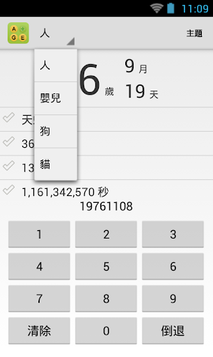 您只需簡單地輸入西元年月日,便可得到的實際年齡,它包含了人的年齡,嬰兒年齡,狗的年齡和貓的年齡計算。