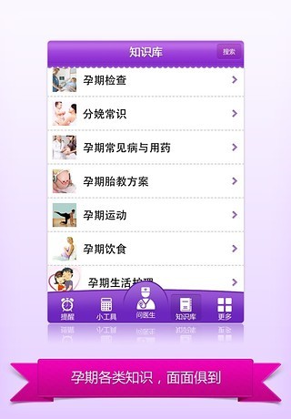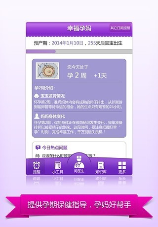 “幸福孕妈”四大专业功能,为广大孕妈安度孕期提供帮助:(1)提醒功能:每日为您精心准备的健康提醒,由各地区妇产医院的近百位知名妇产专家对内容进行审核和筛选,内容涵盖宝宝发育、妈妈身体变化、产检项目、饮食、锻炼等每日温馨提示。(2)在线咨询功能:百余位权威的专家医生和经验丰富的医务人员,为孕妈备孕、孕期及产后各类疑惑,提供在线咨询和疑难问题解答服务,解除每位孕妈的后顾之忧。(3)知识库功能:5000余个经过权威顾问专家提炼的知识点,根据孕妈妈需求进行合理分类,(包括:备孕、早期、中期、晚期、分娩、产后、育儿)例如:备孕阶段,我们为孕妈提供了遗传优生、身心调整、孕前检查、怀孕禁忌、饮食调理、生男生女六个部分。知识库还可以智能搜索,最大限度的方便孕妈妈使用,为迎接新生命的到来,保驾护航。(4)孕期小工具,包括:宝宝血型测试、定时提醒、排卵期预测、预产期计算器等小功能,为孕妈的孕期生活提供贴心周到的服务我们 此外幸福孕妈还与各地区医疗机构合作,为孕妈妈提供精彩贴心的专家讲座、网络课堂视频以及各类互动活动,希望用我们的专业和热情,换来孕妈的幸福和欢乐。