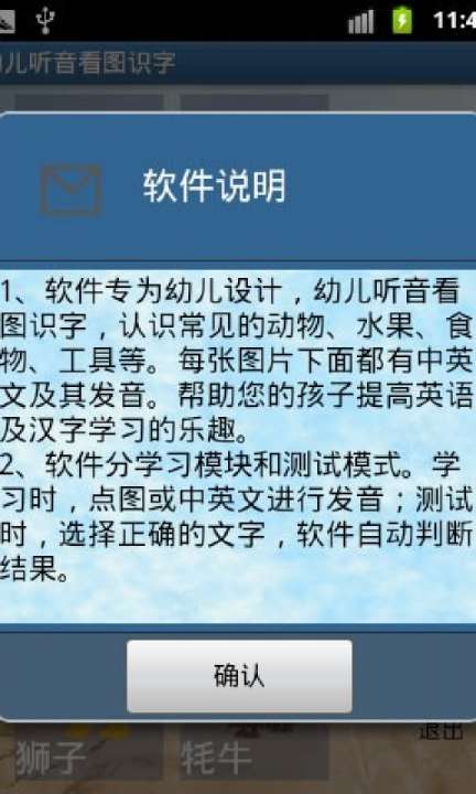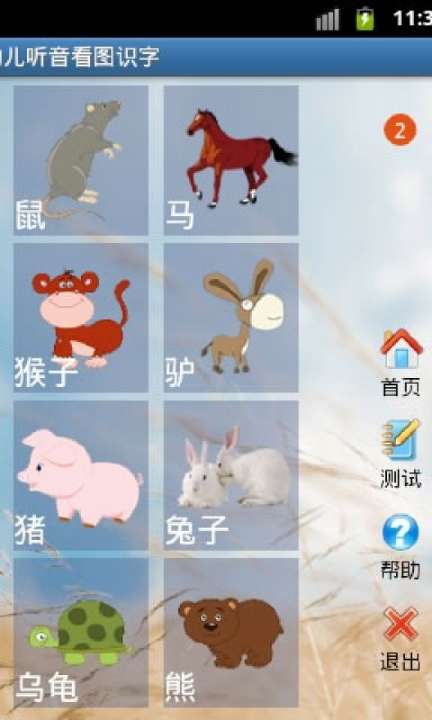 1、软件专为幼儿设计,幼儿听音看图识字,认识常见的动物、水果、食物、工具等。每张图片下面都有中英文及其发音。帮助您的孩子提高英语及汉字学习的乐趣。