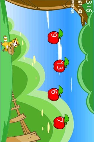 ? ? ?这是一个适合小学生练习心算的小游戏,根据左上角的算式算出正确答案之后,再把最下面的小棕熊移动到带有正确答案的苹果下面接住落下的苹果即可。(小棕熊可以用手指拖动)其中有十以内的加法和乘法,二十以内的加法,在设置中可以设置音乐和音效的开关,还可以设置苹果下落的速度。