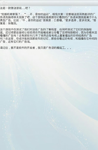 “挖掘机哪家强?……”“……不,是你的益达”,相信大家一定都被这些耳熟能详的广告语洗脑得“体无完肤”了吧,这个游戏就是根据你们看到的广告语来猜测它是属于什么类型广告。比如:“不,是你的益达” 答案是:口香糖。“更多选择,更多欢笑。”答案是:快餐店。