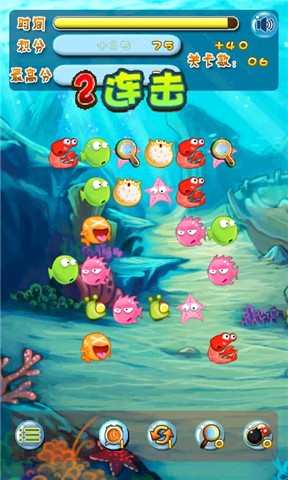 随着关卡的不断深入,海洋生物的种类也会越来越多,时间越来越紧迫,玩家需要充分利用道具的作用,过关斩将。