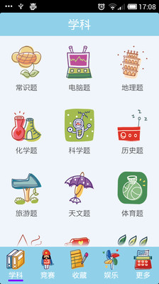 *可以选择物理,体育,自然,文学,政治,地理,常识,历史,化学,天文,音乐,旅游,科技,电脑这十四种来分别做题,系统会自动判断对错.