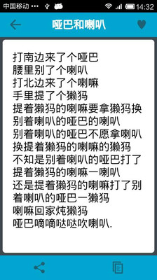 绕口令是语言训练的好教材,认真练习绕口令可以使头脑反应灵活、用气自如、吐字清晰、口齿伶俐,可以避免口吃,更可作为休闲逗趣的语言游戏。软件收集许多非常有趣的绕口令,适合各个年龄段绕口令爱好者阅读试炼,相信聪明的你一定能够顺利读完大部分绕口令。