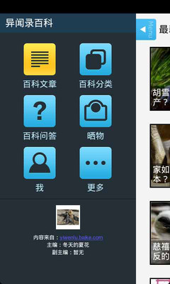 社会有很多的传闻,关于人类的,关于自然的,关于动物的,这些都是人类最爱看到的。那么,你愿意看到这样的百科吗?在哪儿有什么奇怪的鬼屋,或者是哪种植物发生了变异,或者是动物有奇特的表现呢?