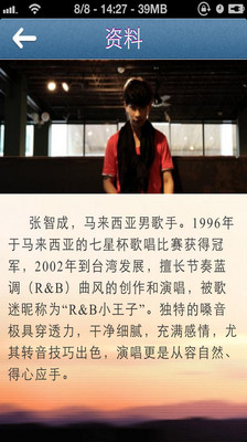 张智成,马来西亚男歌手。1996年于马来西亚的七星杯歌唱比赛获得冠军,2002年到台湾发展,擅长节奏蓝调(R&B)曲风的创作和演唱,被歌迷昵称为“R&B小王子”。独特的嗓音极具穿透力,干净细腻,充满感情,尤其转音技巧出色,演唱更是从容自然、得心应手