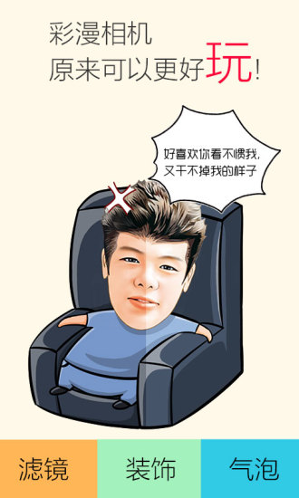 嗷呜~嘟嘟嘟~狼叫声、号子声,彩漫相机版本更新,五彩漫画场景搭配逗逼文字,更有专属贱萌声音。号子已吹响,赶快开启彩漫之旅吧~新增滤镜功能,画面更多样哦~~新增文字气泡功能,点开有惊喜哟!世界杯全明星阵容系列重磅上线,彩漫相机让你与喜欢的明星合为一体,清凉一夏,要你好看!彩漫相机——告别黑白漫画手机也能拍出彩色漫画?亲,我读书少,可别骗我!没错,全球第一款彩色漫画相机重磅来袭,还在使用黑白漫画?Out了!!!彩漫相机——个人形象与彩色漫画的完美融合。龙王三太子哪吒,独臂大侠杨过,超人,超级英雄蝙蝠侠,更有各种白富美、俏佳人、女汉纸、蛇精病造型等你来玩转,脸型、发型、配饰……百种选择,让你想怎么换就怎么换!个性化时代,自定义精彩!想要自己的Q版卡通形象?想让心情时刻缤纷美丽?想将生活过得个性百变?彩漫相机为你轻松解决:随手一拍,属于你的个性彩漫立刻呈现。新技能get√,彩漫生活从此与众不同!