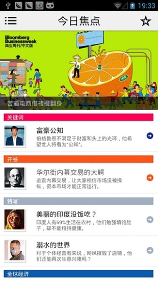 1.提供最国际化、最启发商业灵感、最有趣的商业报道——《商业周刊/中文版》(Bloomberg Businessweek)是为中国商业精英量身定制的国际商业周刊,借助彭博社遍布在全球72个国家的2300多名新闻和多媒体专业人员,以及一流本土采编团队,提供富有洞见的原创商业报道及分析,助你在全球范围内更好地把握商业机遇。