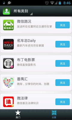 3.“分类”收录了生活、娱乐、购物、美食、出行、交友等多个类别的微信公众账号,方便您筛选与查找!
