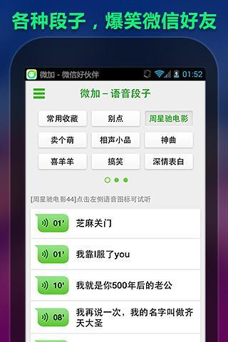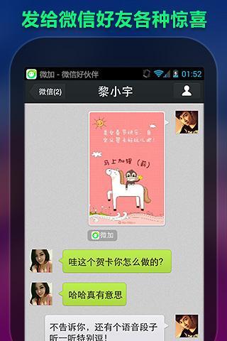 微加,就是微信加强。有了微加,微信朋友圈能发语音了!微信的聊天太古板了有木有?让喜欢个性的我们伤不起呀!个性表情,彩色图文聊天,个性语音,爆笑段子等,让你的微信与众不同,充满个性!不用离开微信,直接浮层打开,太方便了有木有!!
