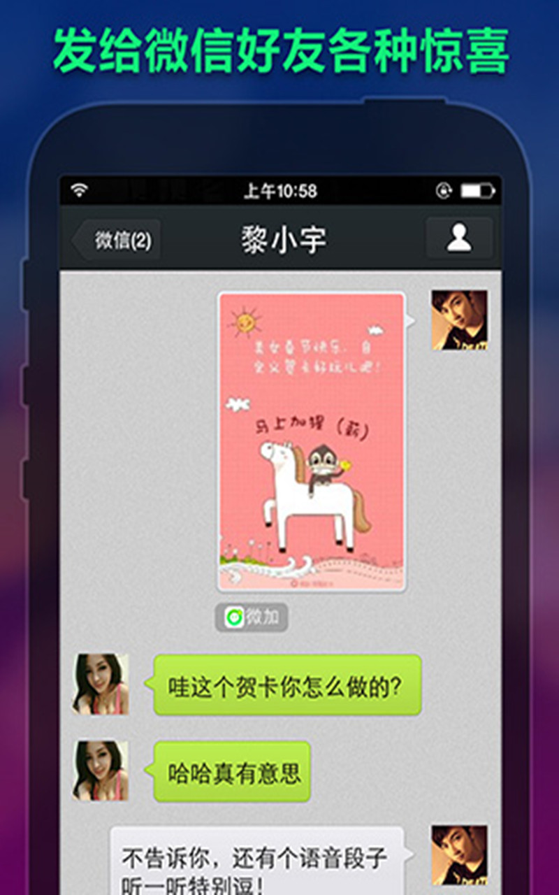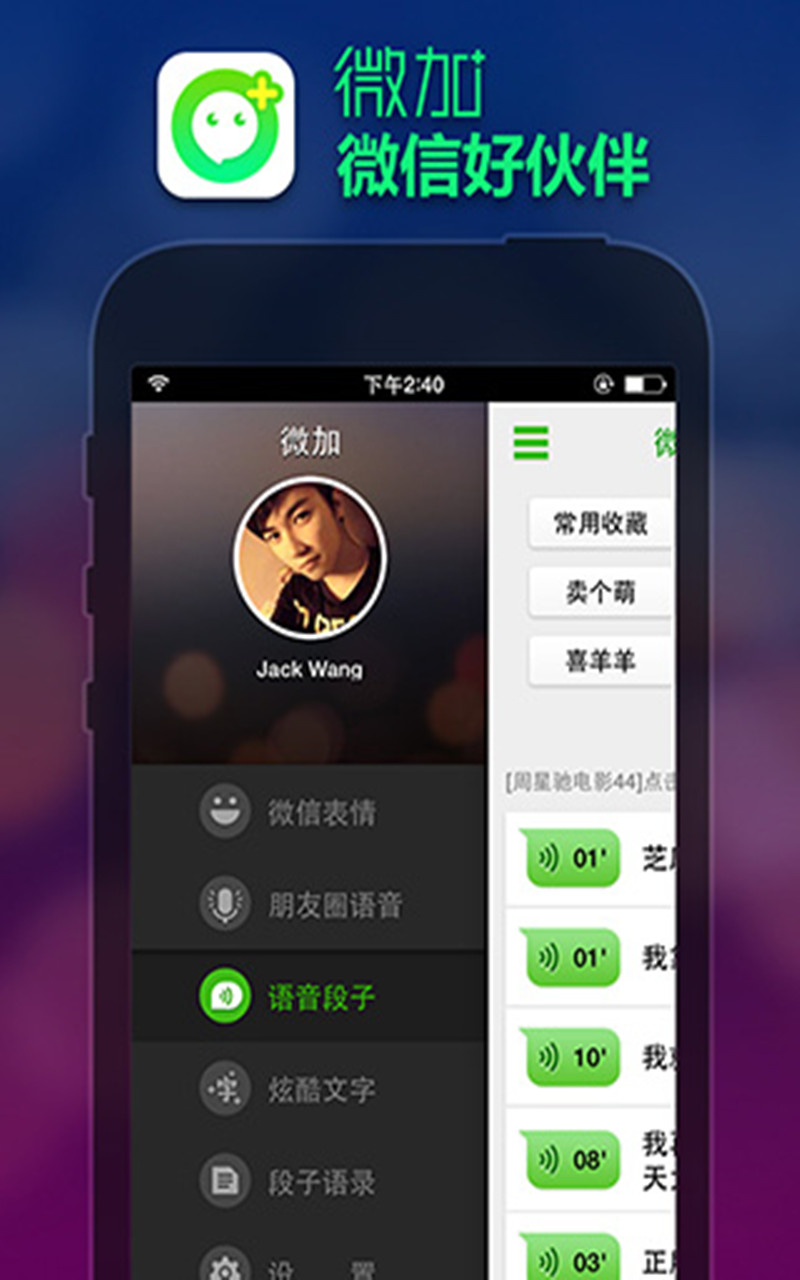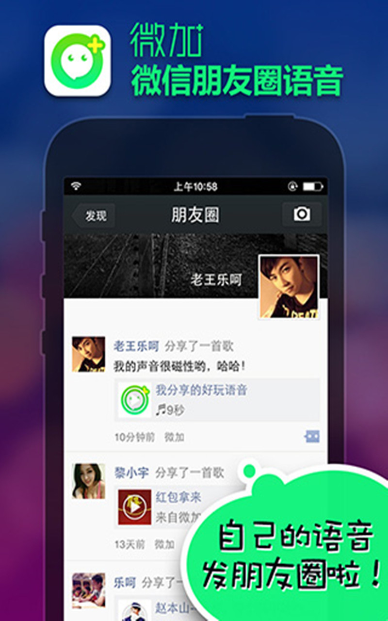 微加,就是微信加强有了微加,微信朋友圈能发语音了!微信的聊天太古板了有木有?让喜欢个性的我们伤不起呀!个性表情,彩色图文聊天,个性语音,爆笑段子等,让你的微信与众不同,充满个性!不用离开微信,直接浮层打开,太方便了有木有!!