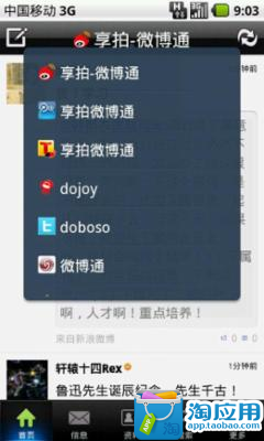 微博通是一款微博聚合客户端,多个微博一款客户端全兼容。支持新浪微博、腾讯微博、搜狐微博、网易微博、百度说吧、移动微博、嘀咕、饭否、做啥、人间网、天涯微博、人民微博、新华微博、Google Buzz、豆瓣、凤凰微博、开心网、人人网、和讯微博、中金微博、同学网、开开社区,共20多家微博及SNS网站。方便同步和帐号管理。支持私信对话聊天模式、支持发微博表情。支持一键删除私信对话、支持复制微博等功能。