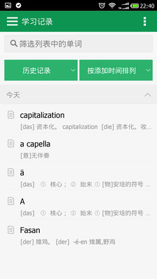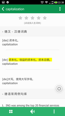 《德语助手》Android版- 拥有与桌面版相同容量的词库。包括了德汉-汉德词典、德语近义词词典、德语专业词典以及德德、德英等大量词库- 轻松查变位,支持德语所有十八种变位形式以及变位反查功能-德语单词真人发音- 完善的生词本、历史记录功能- 智能Accent纠正,解决德语字符输入问题- 生词本网络同步