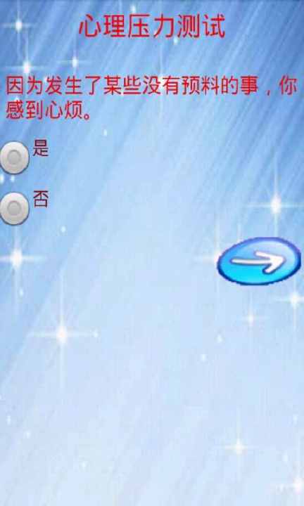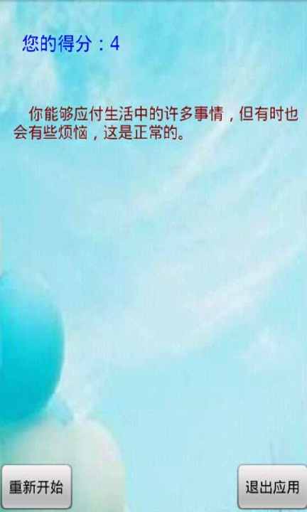 生活不如意,十有八九,每个人都会有些心理压力,但我们首先要了解自身的压力到底是否在可控范围内,接着就是如何自我调节,在压力中找到动力,让生活更加充满激情。千万不能让压力成为我们的负担,影响我们的生活质量。做个测试来看看你心理压力是否在可控范围内,接下来就看你是个真的勇士还是一个任压力摧残的温室小花朵了?主要功能:2012.11.03更新日志:调整UI设计
