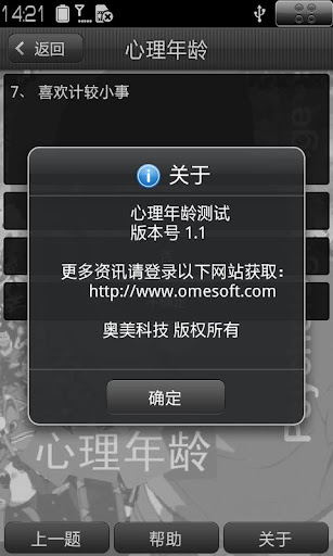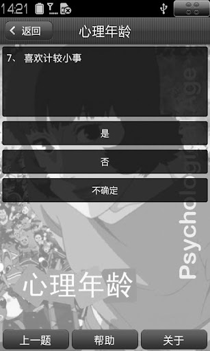 人的心理年龄(psychological age)与其实际年龄并不总是一致。有的人年纪轻轻,心态却十分保守,老气横秋;有的人虽已近知天命之年,却总是充满朝气,积极乐观。测一测心理年龄对于调整心态很有帮助。