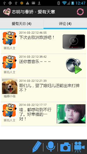 应用在主界面可播放全景动画和优美乐曲, 为每一个打开应用的亲友营造一片温馨浪漫的氛围,由此开始与新人同行,见证一场宏大的婚礼。 作为应用的所有者,新人可以通过文字、图片、录音、录像等多种媒体形式分享他们的爱情故事。亲友能够浏览故事并发表多媒体评论。