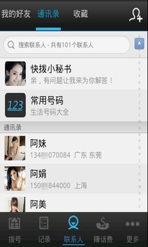 快拨美眉免费电话是一款快速、便捷专业的android智能应用软件,非常适合时下的年轻男女。立即下载即可享受每日免费签到、免费抽奖等众多免费体验!还有美眉等着你哦,还等什么呢,赶快下载吧。