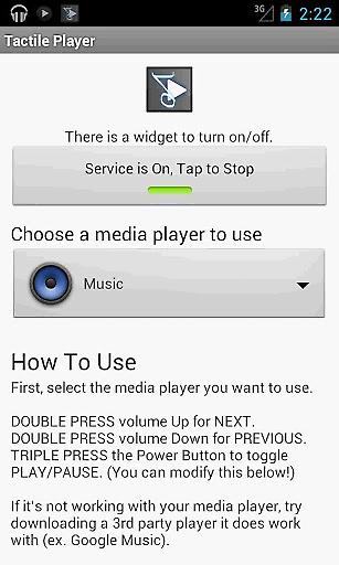 快速切歌Tactile Player帮助您从繁琐的切歌中解脱,无需开启屏幕,双击音量键即可快速切换上一首、下一首,支持大部分原生和第三方播放器。您可以通过Widget随时关闭/打开服务。