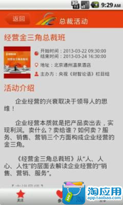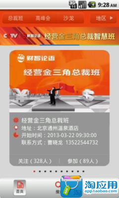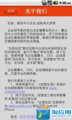 企业领导者的修为决定着事业的大小,事业的大小决定着员工的前途命运,员工的前途命运决定着家庭的幸福安康,家庭的幸福安康决定着国家民族的发达强盛。"总裁社区"移动互联平台依托央视财智论语的资源优势,致力于通过"移动互联、线下互动、视频传播"为企业董事长、CEO、总经理提供"活动资讯、学习咨询、资源整合"的"全方位、全过程、全天候"服务。企业董事长、CEO、总经理既是平台的建设者,又是平台的使用者。我们所拥有三大平台:1、电视传播平台:《财智论语》电视栏目全国联播网 500家城市电视台 www.cctvcaizhi.com2、线下互动平台:经营金三角总裁智慧班 财智英才共生俱乐部3、移动互联平台:"总裁社区"互联网平台 www.ceofw.com 移动互联 Android IPhone