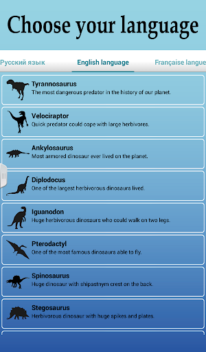 該應用程序是非常容易使用,你只需要選擇您想要的語言,點擊intrerisuyuschego你恐龍百科全書還包括恐龍的照片和說明,
