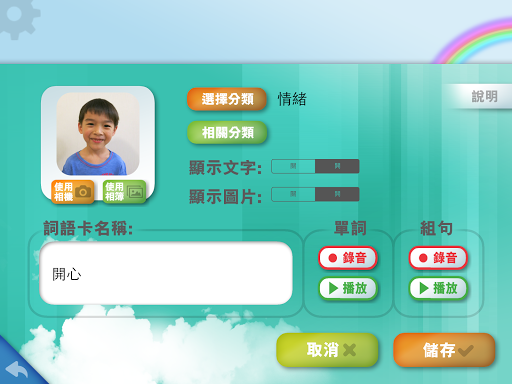 本應用程式特設多項自訂功能,讓治療師及家長可按照個別使用者的能力調節內容。可自訂的項目包括: