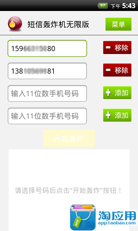 您是否经常受到陌生人短信骚扰,电话骚扰.现在拿起你的手机,使用本应用惩罚骗子,恶性骚扰的人.只要输入手机号码就可以利用网络短信无限轰炸对方手机,之前所受过的闷气十倍的奉还.功能:1.本应用是通过互联网第三方接口发送垃圾短信给他人,不会扣取您任何的手机话费或短信费用.2.发送的短信不会显示自己的号码.3.软件支持移动,联通,电信.