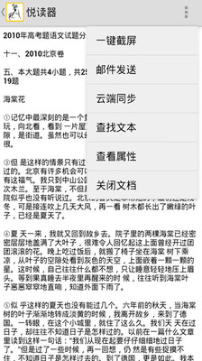 “悦读器”是目前市场上功能最多的云阅读器,支持Word、Excel、PDF、纯文本、图片等多种格式的浏览,同时支持邮件发送、云端同步、截图、PDF生成、水印添加等诸多附加功能。您可以使用百度、新浪、人人、QQ账号登陆,随时上传与下载自己的文档。