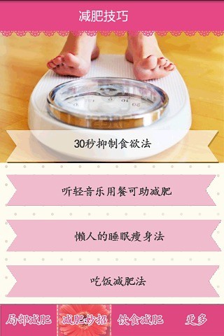 许多女生都想不花多少精力就能达到瘦身的效果,也就是所谓的懒人减肥法其实,不流汗不花许多精力的减肥也能达到瘦身的效果,只要平时注意一些减肥的细节,轻松瘦身哦对于懒人来说,当然是想花最少的时间和精力来塑造最完美的身材啦,因此在这里,为大家推荐了一些懒人们专属的瘦身美体的小妙招,让不运动的你也能拥有魔鬼般的身材本软件来制作于应用公园:http://www. apppark.cn