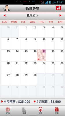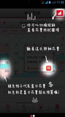 只要有支出立即输入金额就能快速记录,在画面上也会直接显示「本日预算」、「本日花费」以及用大大的数字显示「本日可用余额」来提醒你,多少让你有些警剔,每天的记录可用「月历」的方式呈现,当日若有超支的情况会用「红色」标示,一眼能明白这个月你有几天是失控的,下个月就请好好收敛收敛。而仍喜欢用图表来看自己的花费状况的话,也可切换为简单的柱状图模式,适合给有不同需求的使用者查看。