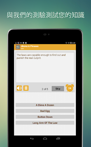 這個程序的目的是讓一個簡單而流暢的用戶體驗。所有的成語和短語分為3類這是習語,詞組,成語和短語。現在,你也可以選擇你從我們的20個不同的類別分為動作,動物,外觀,商務/專業人員等等。如果這還不夠,所有的條款都按字母順序列出更快的搜索功能,輕鬆瀏覽整個應用程序。成語和短語詞典成語報價與APT的例子讓你了解和正確使用所有條款的含義。