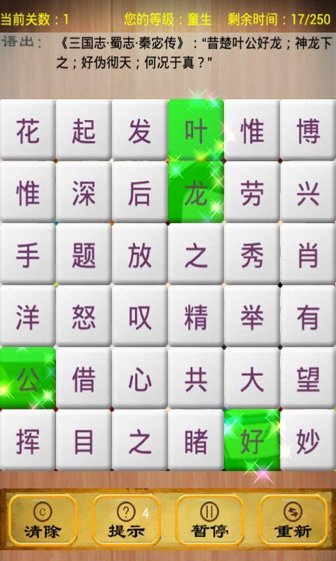 成语消除是一款超级好玩,寓教于乐的文字益智游戏。你只要按顺序选中一个成语的四个方块,这些方块就会消除.美丽的界面,简单易上手的操作,耐玩有趣的挑战,它绝对是你闲暇时候的好伴侣.游戏分为普通篇和困难篇,一共多达100关,你需要在规定时间不断挑战你的汉语水平,准备好了吗?