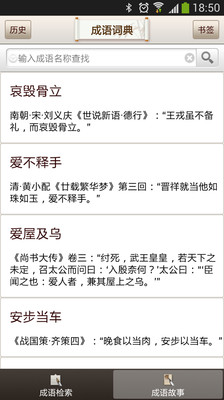 成语词典完全离线查询,收录三万多条成语,包含成语的释义、出处、实例等解释。同时收录了一千余条成语故事。