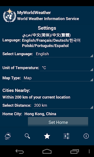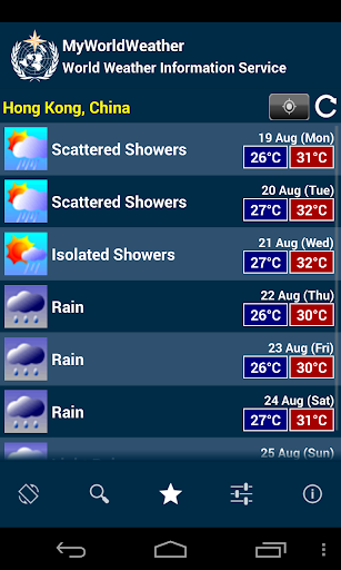 「我的世界天氣」是一個提供超過1,700多個世界城市官方天氣預報及氣候資料的應用程式。現時它支援Android平台,並提供包括中文、西班牙文、波蘭文、阿拉伯文、法文、英文、萄文、德文及韓文等九種語言。