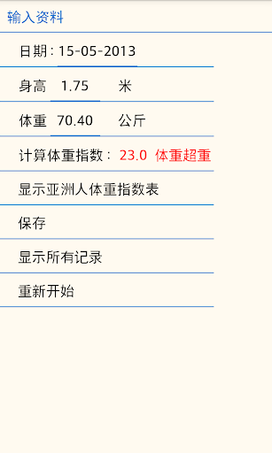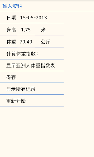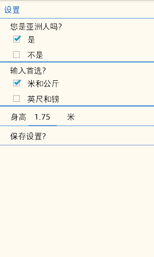 有几个设置,可让您设定. 如果您不希望将其配置, 应用程序将定您是亚洲人和使用公制系统. 此应用程序之允许每日一个记录, 您可以在显示所有记录內删除记录.